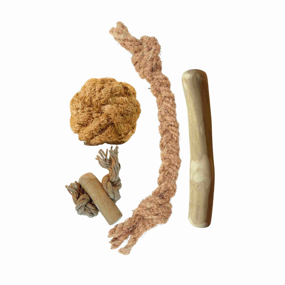 In ons natuurlijk kauwen en spelen pakket zitten 4 verschillende producten.